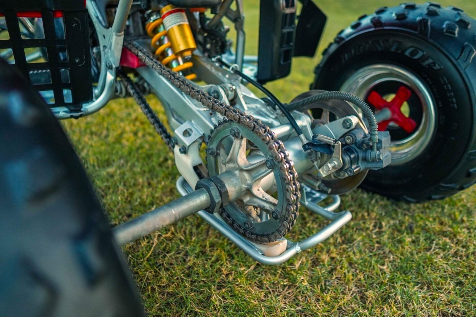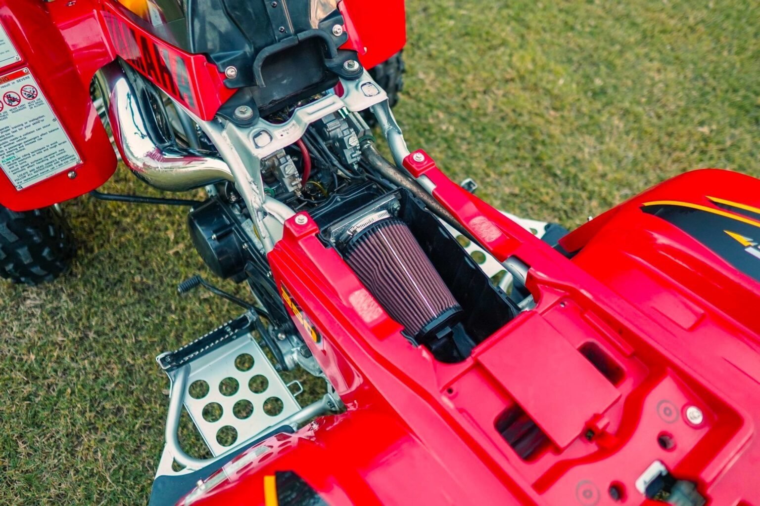 Finished in red with multicolor graphics, the Banshee keeps its original styling and silver tubular steel frame. It has a black solo seat, nerf bars, and a 3.2 gallon fuel tank, along with headlights that have been fitted with retro color-matched covers. Multi-piece wheels wear older tires showing sidewall cracking, and a spare set of sand-tread wheels are included – the new owner would be wise to budget for some new tires before any riding is attempted.Suspension is handled by Works Performance shocks and double wishbones up front, with an adjustable piggyback-reservoir monoshock and swingarm at the rear. Braking is handled by two hydraulic discs up front and a single unit on the rear axle. The controls are mounted to a Renthal cross-braced handlebar with standard switchgear and thumb throttle, and like most Banshees, it lacks instrumentation.