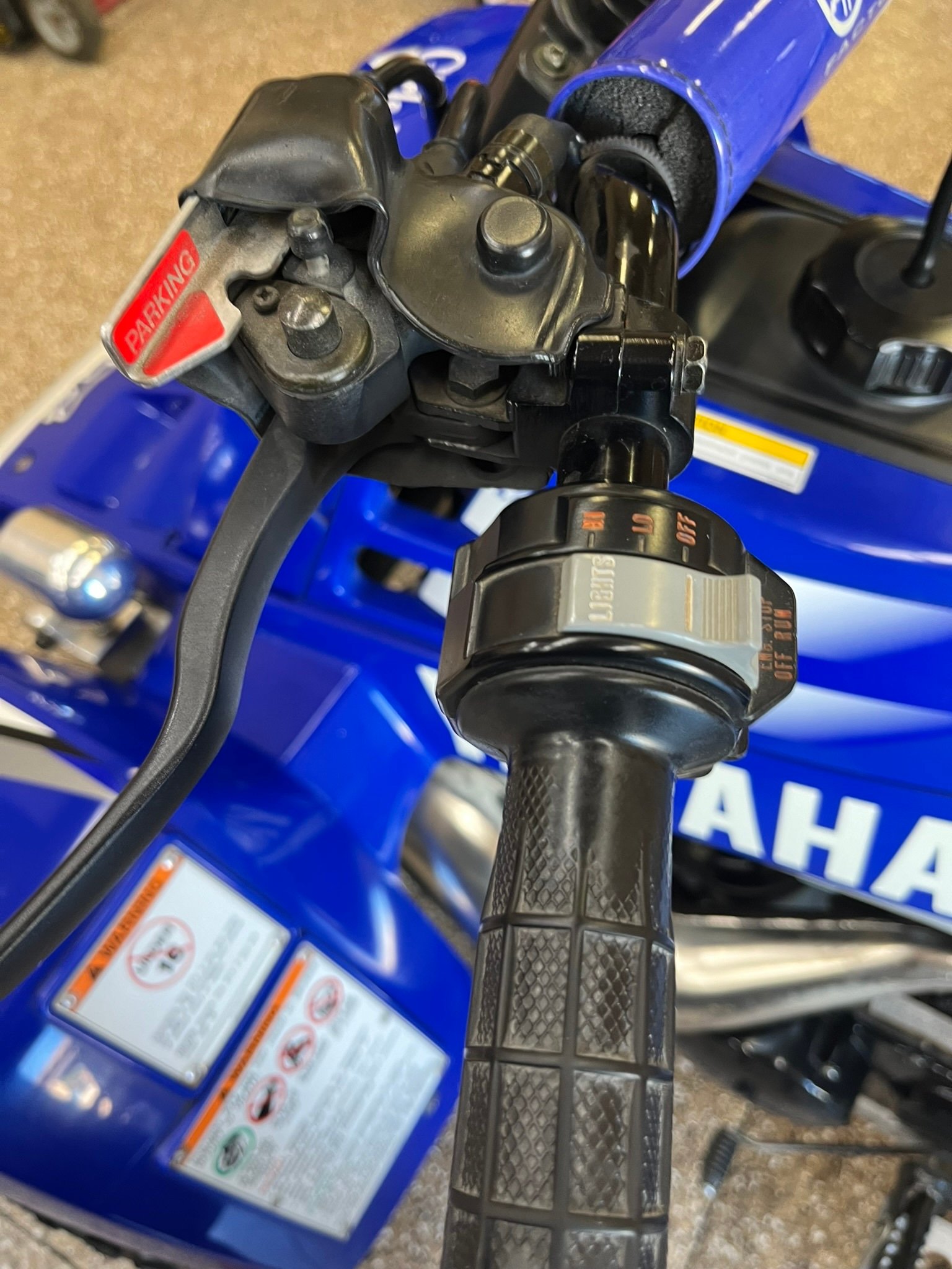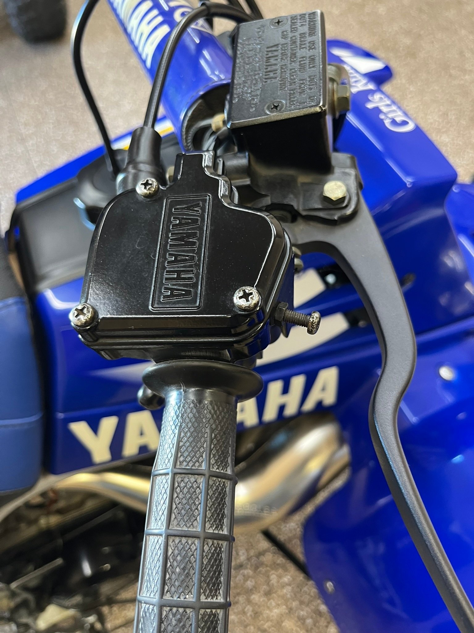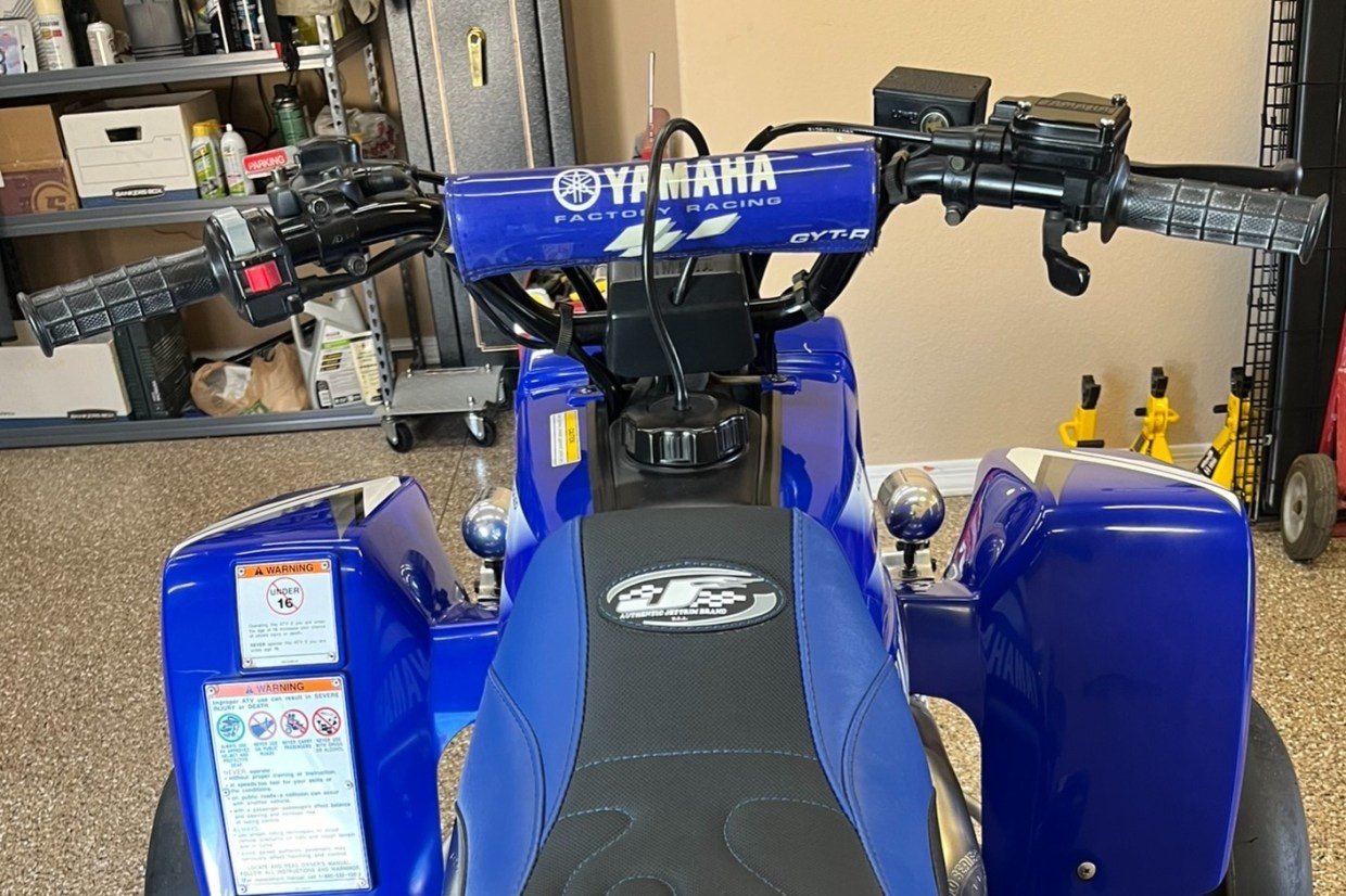 Suspension consists of a pair of preload-adjustable shocks and double wishbones up front, while the rear setup features a swingarm fitted with an adjustable piggyback-reservoir monoshock.The black handlebar wears a Yamaha-branded pad on the crossbrace and is equipped with switchgear for the lighting and ignition as well as a clutch lever on the left and a thumb throttle and brake lever on the right. No instrumentation is equipped, therefore total mileage is unknown.