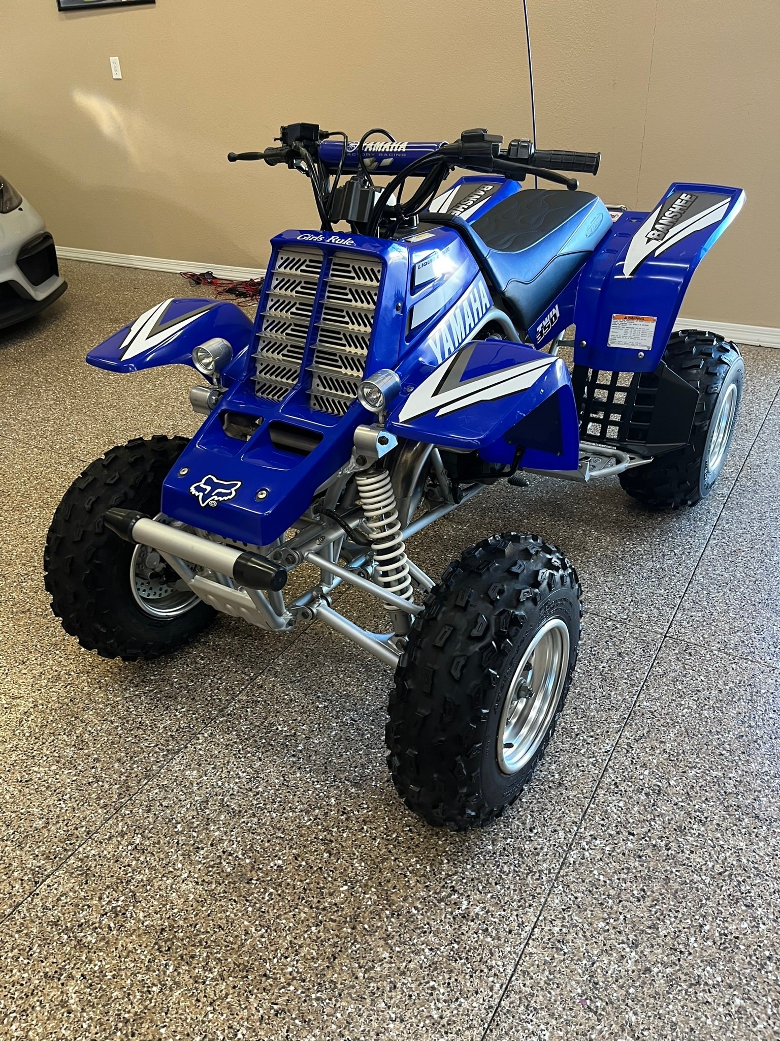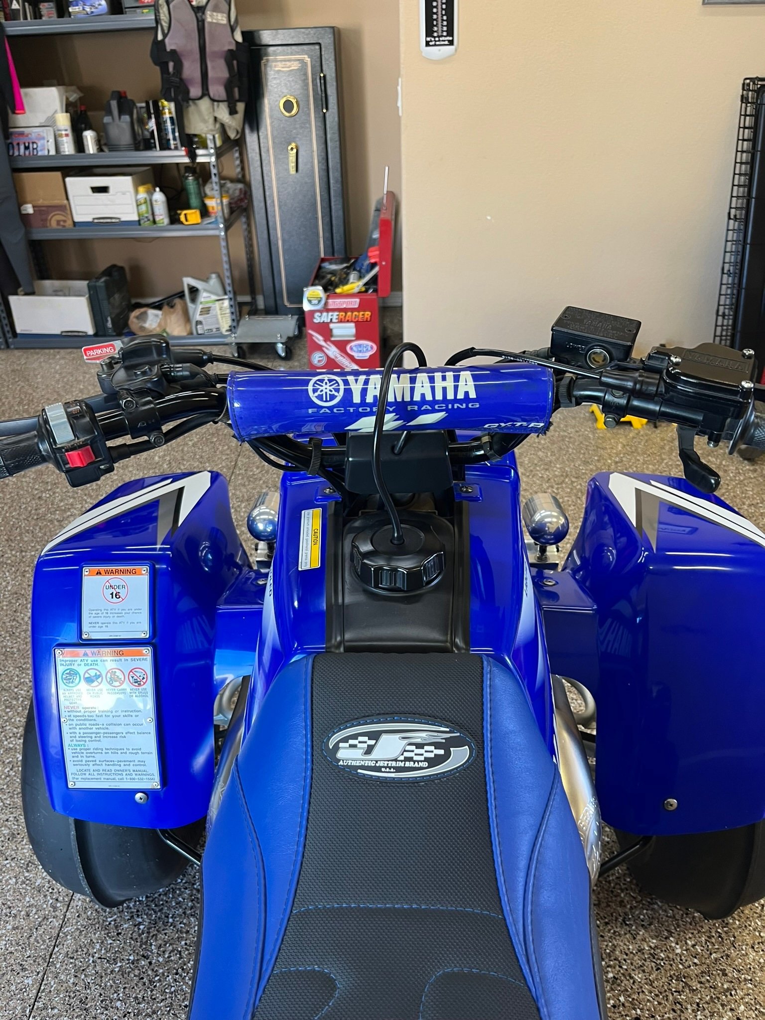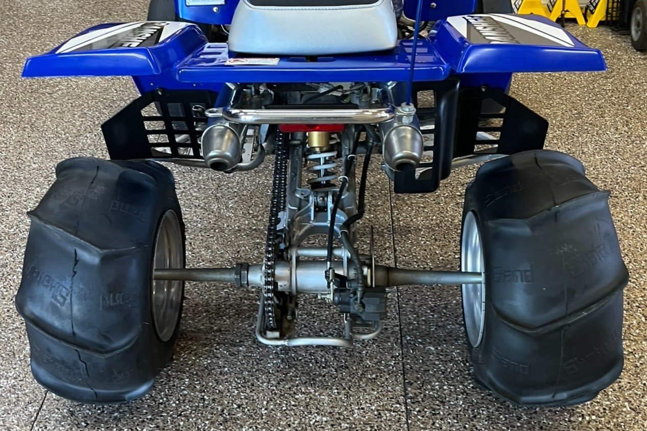 Suspension consists of a pair of preload-adjustable shocks and double wishbones up front, while the rear setup features a swingarm fitted with an adjustable piggyback-reservoir monoshock.The black handlebar wears a Yamaha-branded pad on the crossbrace and is equipped with switchgear for the lighting and ignition as well as a clutch lever on the left and a thumb throttle and brake lever on the right. No instrumentation is equipped, therefore total mileage is unknown.
