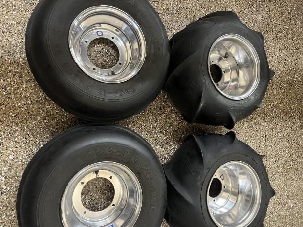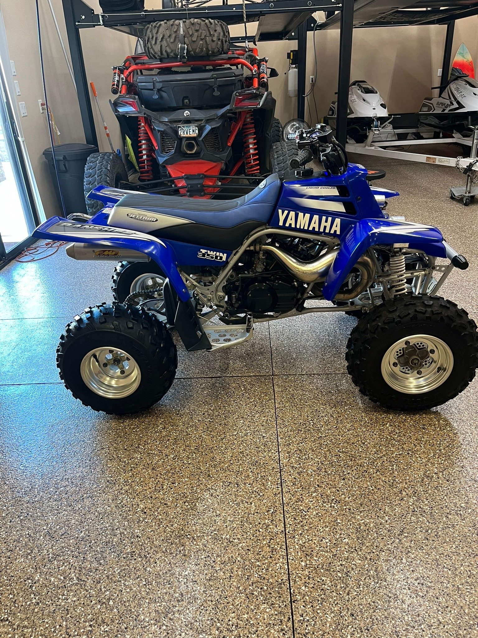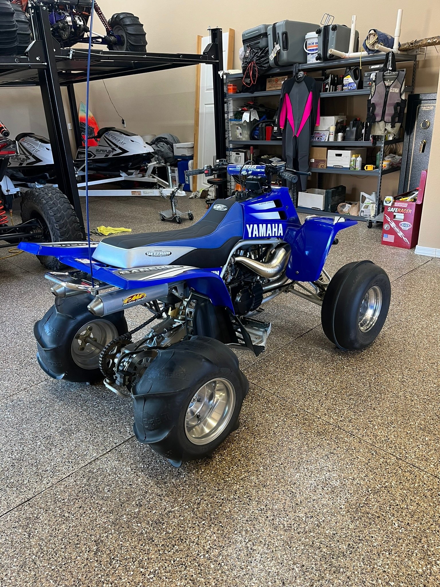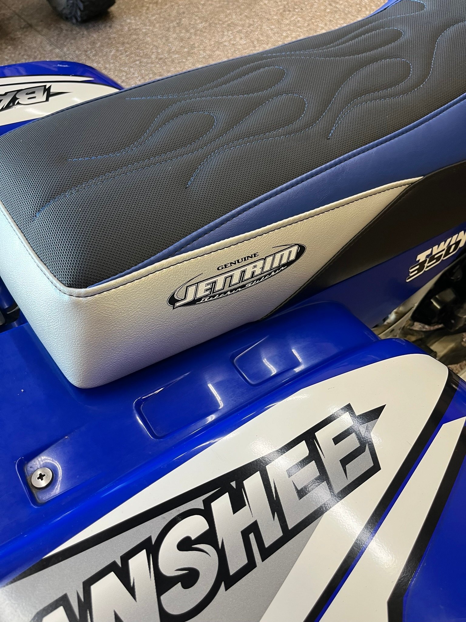 The blue bodywork wears black and white graphics and is mounted over a silver-finished tubular steel frame. Features include a solo seat with a blue, white, and black Jettrim seat cover, a 3.2-gallon fuel tank, Laser Star billet headlights, a taillight, a chrome rear grab bar, a safety flag mount, and nerf bars.Multi-piece wheels are mounted with Dunlop tires. Stopping power is provided by single discs at both front wheels in addition to a single disc on the rear axle. The seller states the brakes were serviced in 2024.